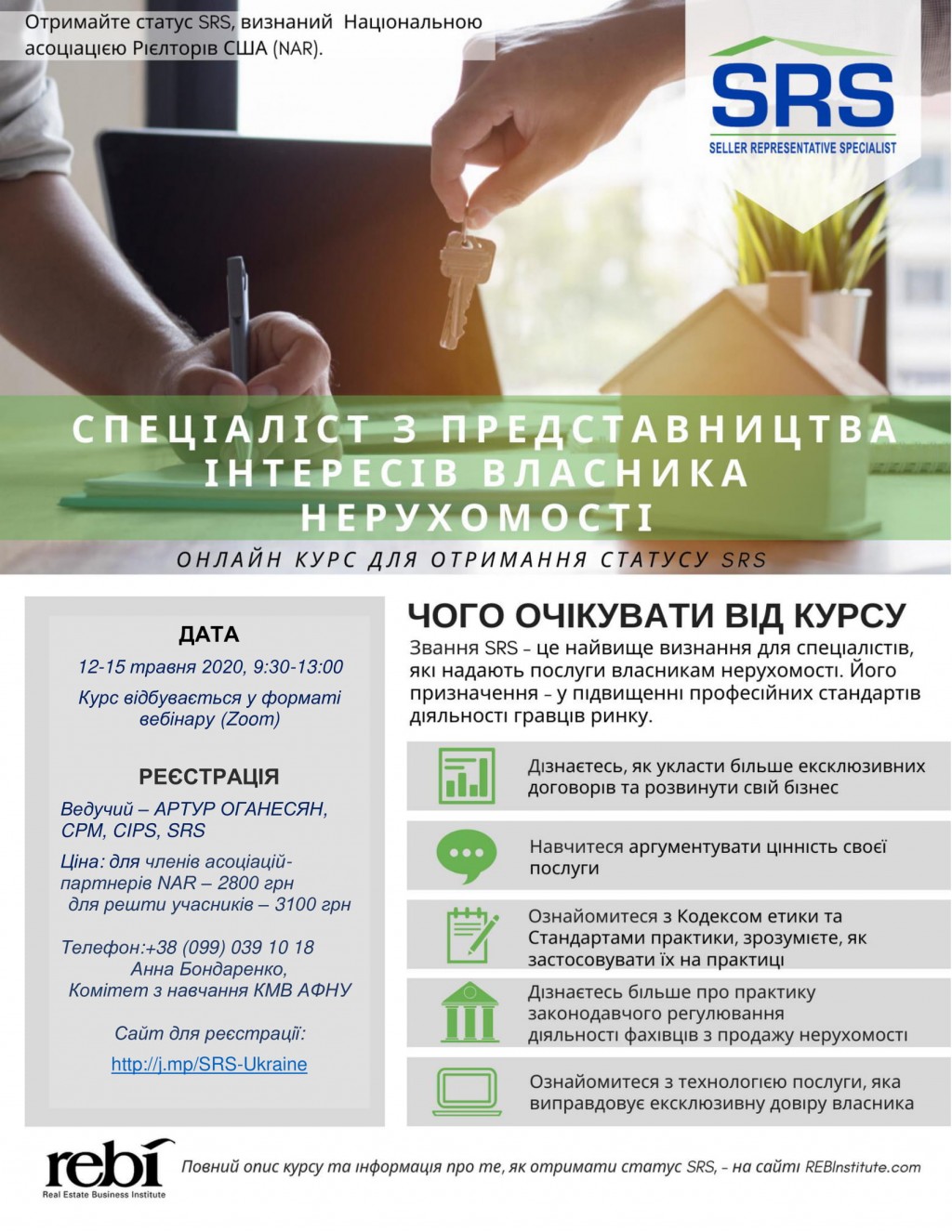 Шановні колеги, як ми раніше повідомляли, Асоціація фахівців з нерухомості (рієлторів) України та Real Estate Business Institute (REBI) підписали ліцензійний договір, відповідно до умов якого Асоціація отримала ліцензію на проведення навчання за програмою під назвою «Seller Representative Specialist» (SRS).