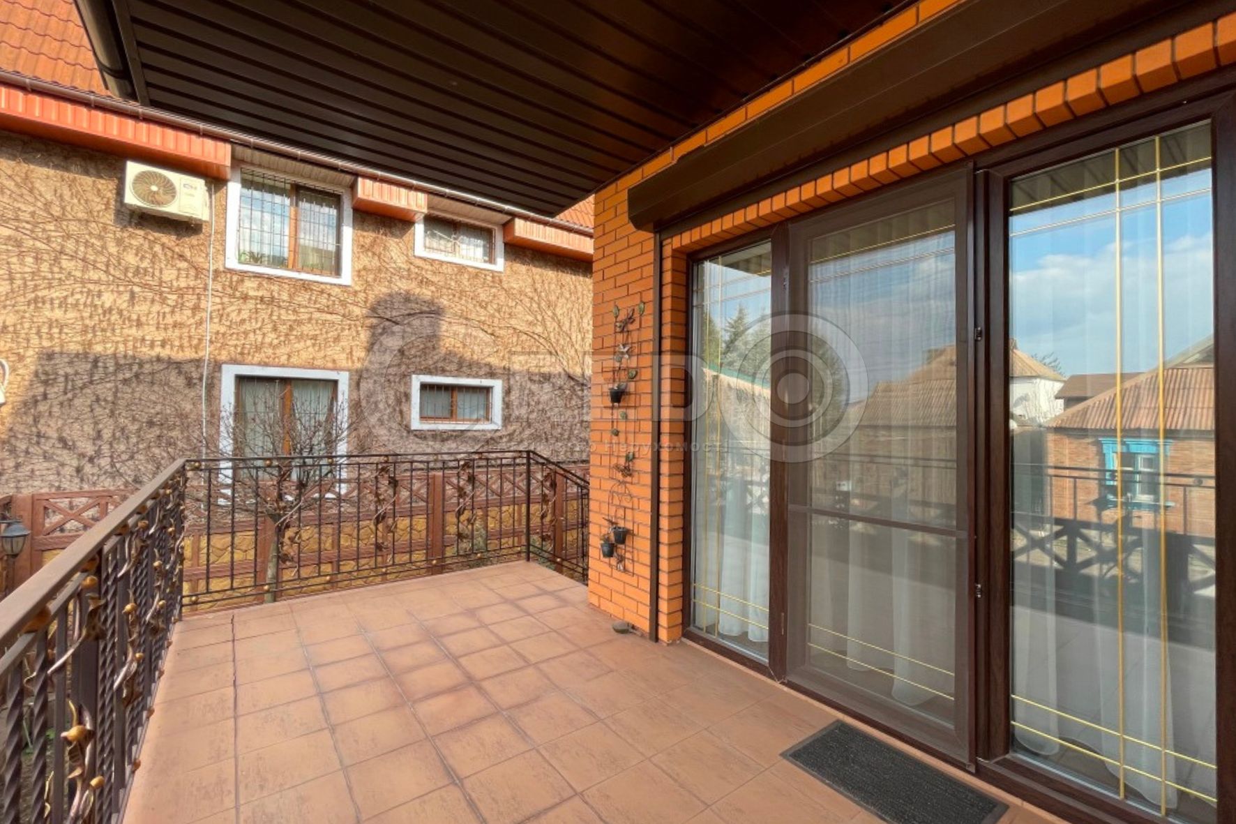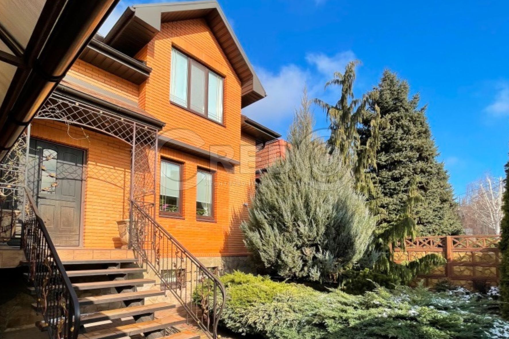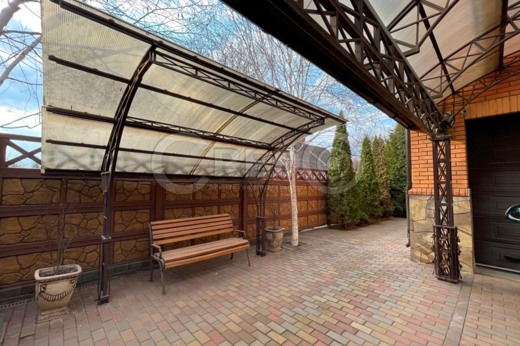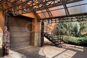 На невеликій ділянці з ландшафтним дизайном зони відпочинку, озеро, хвойні дерева. В'їзд до гаражу накритий великим навісом з кованого заліза та полікарбонату.