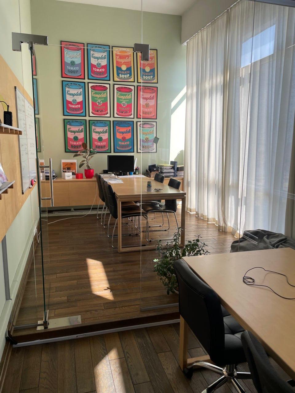 Площа 37 м². Складається з основної кімнати та окремого кабінету за склом. На поверсі лише два офіси - тиха робоча атмосфера. Додатково спільний коридор, санвузол, зона кухні, балкон. Є мікрохвильова піч і кавомашина, спільні для поверху.