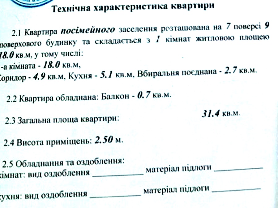 1 кімн., площа 30/14/6, поверх 1/9