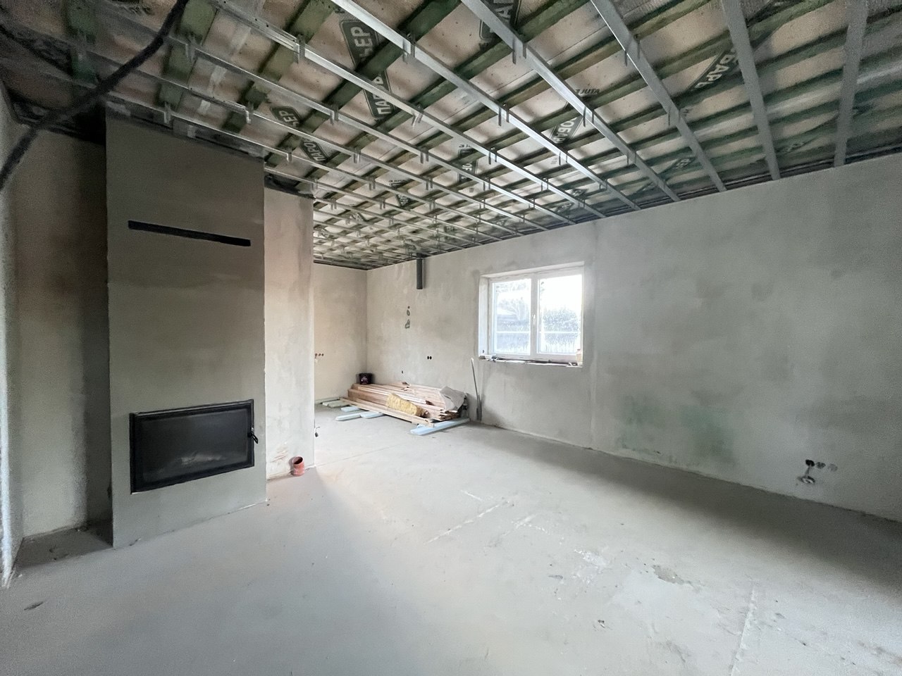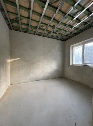 Планування: тамбур, коридор, вітальня з вже встановленим каміном фірми Dovre та виходом на криту терасу, кухня, дві спальні, санвузол, технічне приміщення та мансардний поверх оздоблений деревом з відкритим простором.