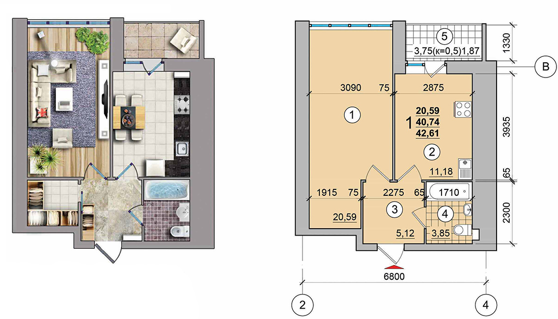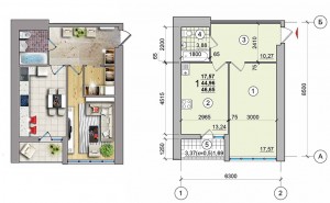 1-кімн.кв. загальною площею: 42,08м, кімната - 20,8мм, кухня - 10,44м, с/в - 3,85м.