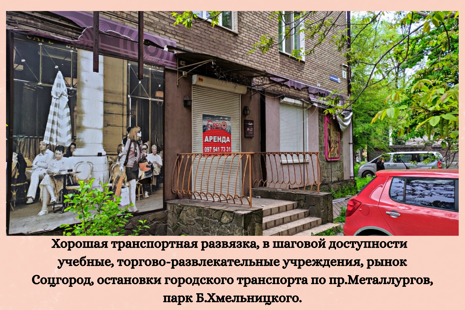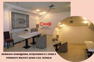 Продается нежилое помещение, встроенное в 1 этаж 5 этажного жилого дома о.пл. 160кв.м., на два входа, стильный ремонт, просторных 4 зала, кабинет, кухня, три с/узла, душевая, подсобное помещение. Помещение выводилось и использовалось под кафе. Осталось часть профессионального оборудования. Коммуникации: отопление центральное (счетчик), индивидуальный ввод электроэнергии (380V) и воды. Установлены охранная и пожарная сигнализации, 5 кондиционеров, наружные роллеты. Хорошая транспортная развязка, в шаговой доступности учебные, торгово-развлекательные учреждения, рынок Соцгород, остановки городского транспорта по пр.Металлургов, парк Б.Хмельницкого. Расположение и формат помещения подходит под салон, офис, магазин у дома или кафе. В дальнейшем можно использовать кафе - магазин. Только продажа 55 000у.е. тел. 097-541-73-31 Этот и другие объекты вы можете увидеть на сайте www.ancredo.com