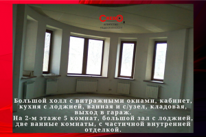 На 2-м этаже 5 комнат, большой зал с лоджией, две ванные комнаты, с частичной внутренней отделкой.