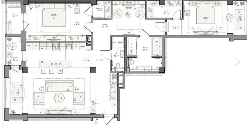 В квартире 2 спальни, кухня-студия, 2 гардероба , 2 санузла.