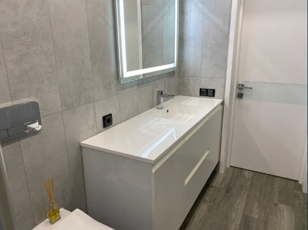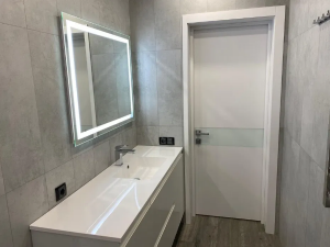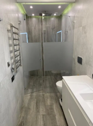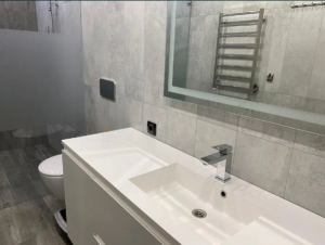 Санузел совмещённый, душевая с трапом 1,5м на 1,5 с огромным тропически душем и лейкой, унитаз и инсталляция Villeroy Boch с гигиеническим душем, все смесители Grohe, большая заказная столешница-умывальник из искусственного камня, стены и пол керамогранит. В санузле выполнена профессиональная гидроизоляция. Имеется тёплый пол, так же как в кухне гостиной.