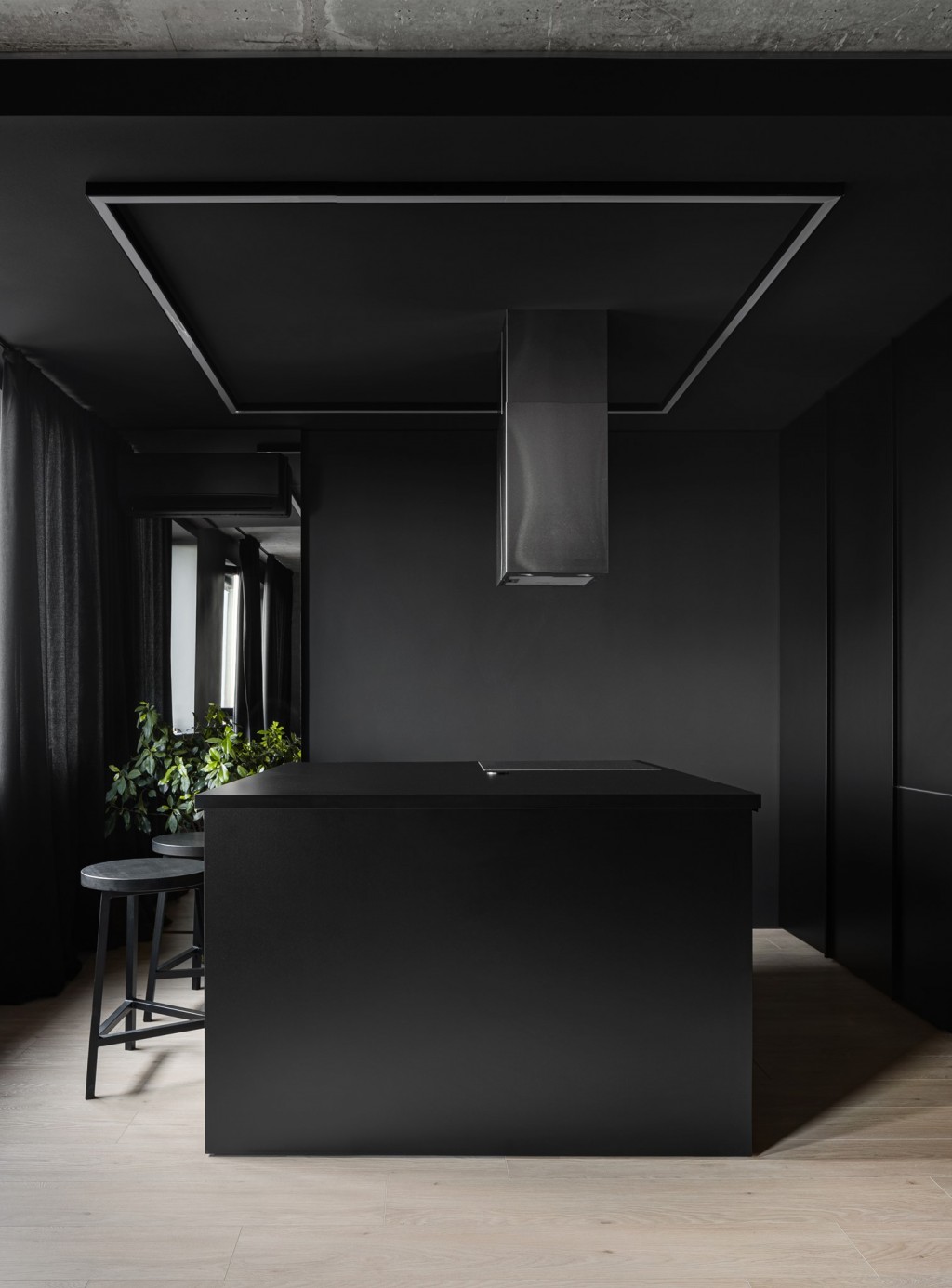 Кухонно-столовая зона с системой кондиционирования состоит: из зоны кухни, оборудованной современной бытовой техникой скрытой за техническими элементами фасадов: духовым шкафом, микроволновкой, посудомоечной машиной; и острова со встроенной варочной поверхностью и парящей над ней вытяжкой.
