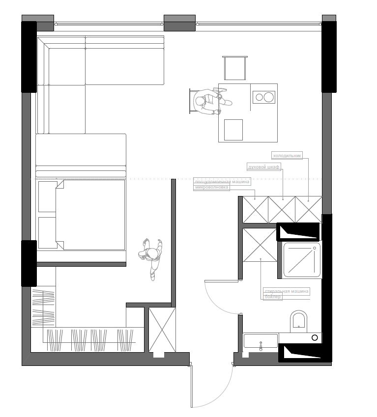В планировке квартиры использован метод функционального зонирования.