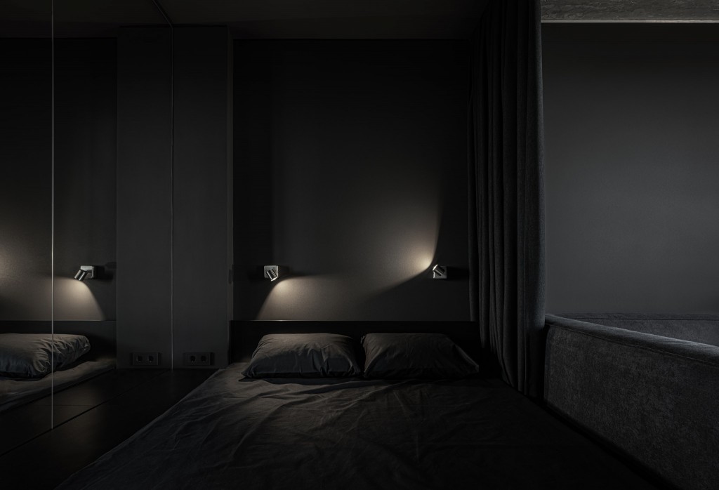 Зона спальни с зеркальной стеной, двуспальной кроватью и телевизором отделена от основного пространства сдвижной системой из текстиля.