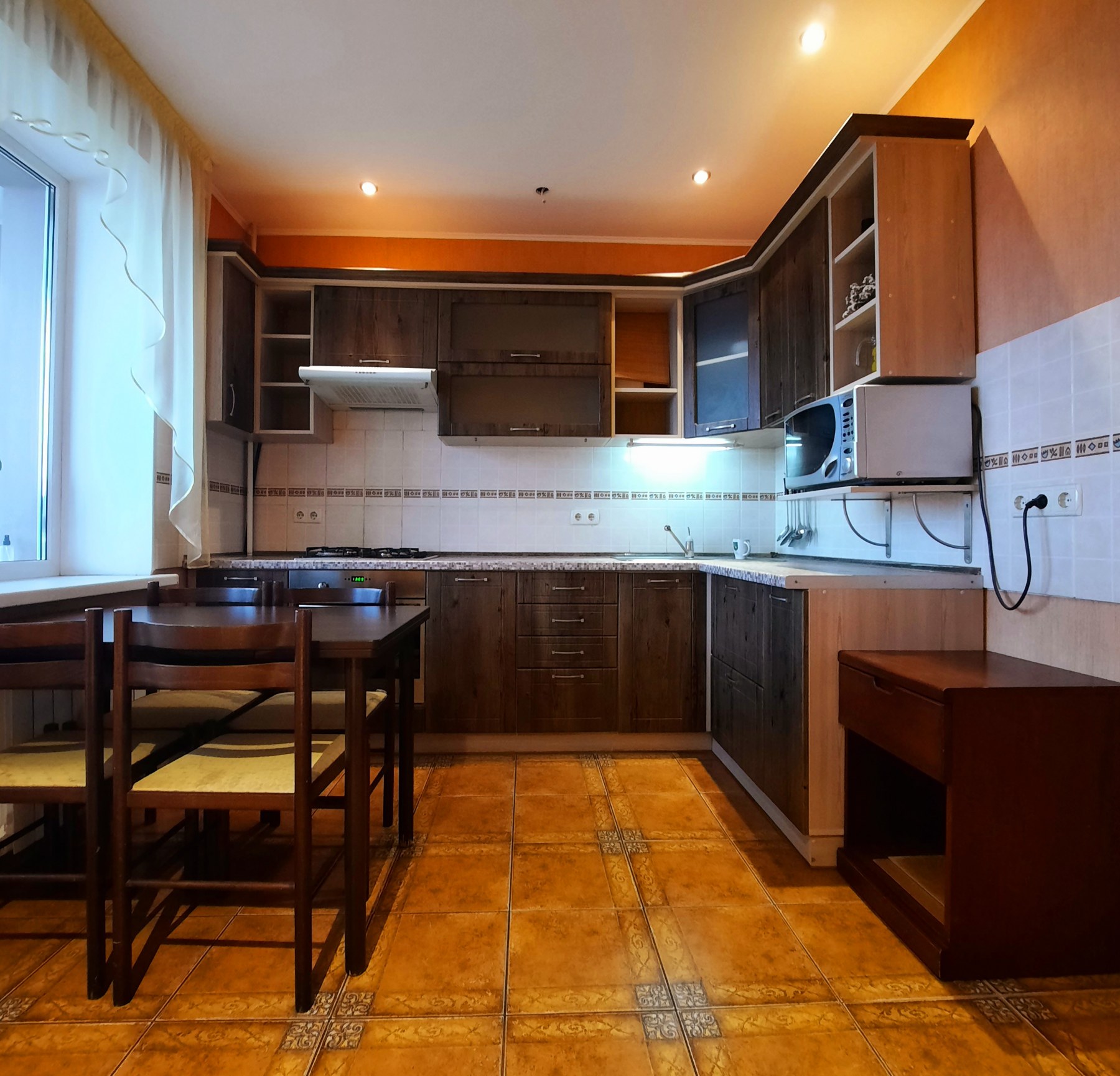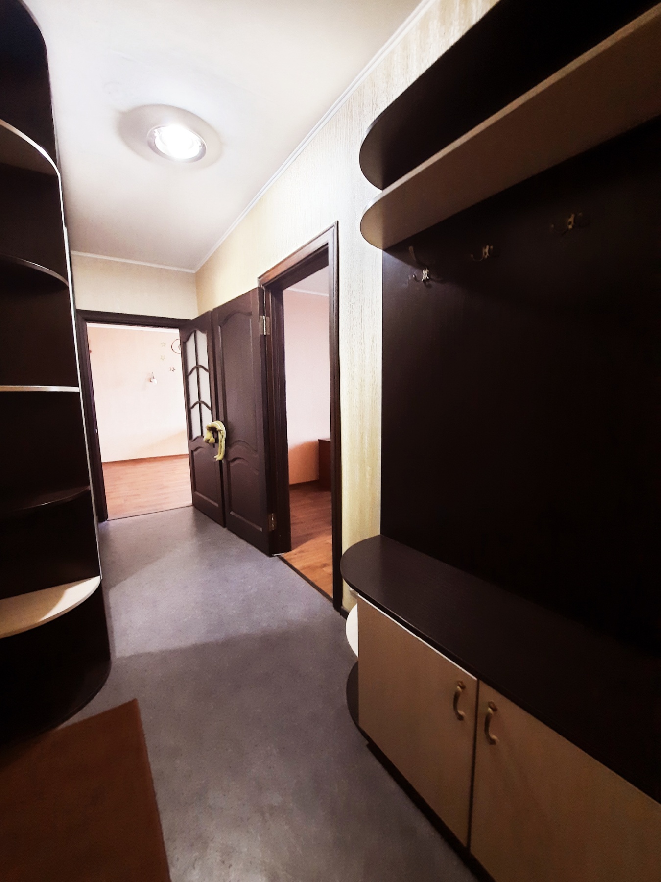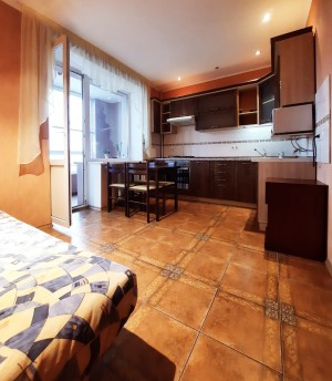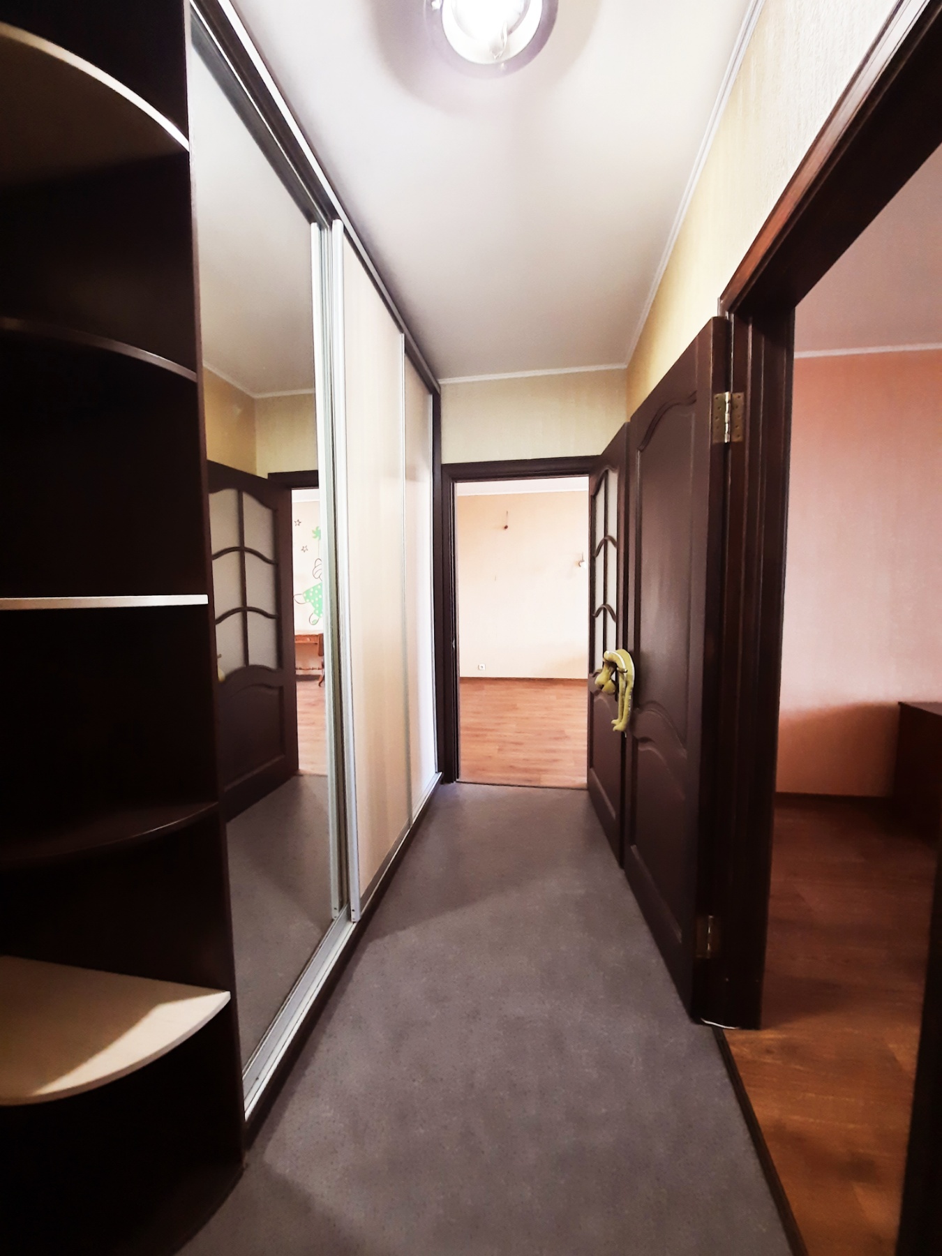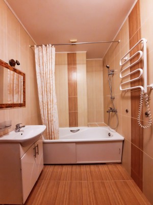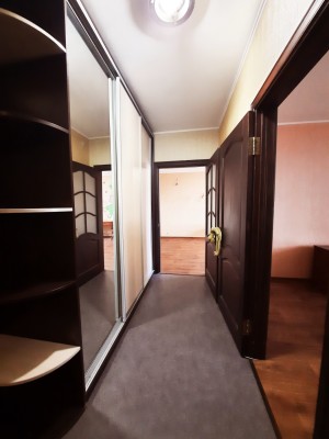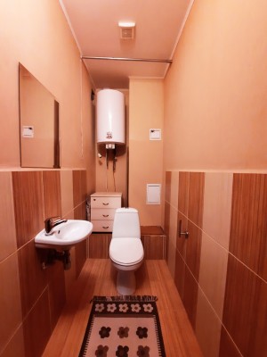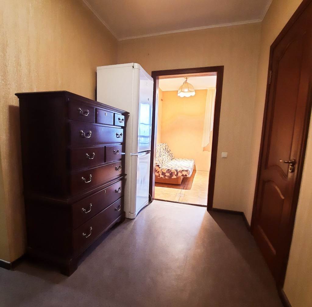 На кухне 13 кв. м остается вся мебель отличного качества со встроенной бытовой техникой: газовая варочная поверхность, духовой шкаф, вытяжка, микроволновка, холодильник, бойлер на 80 л. В спальне 17 кв. м – двуспальная кровать, две прикроватные тумбочки, большая деревянная тумба под телевизор, кондиционер. В комнате 21 кв. м – антикварная мебель (бюро и письменный стол из натурального дерева), комод. В коридоре 8 кв. м – встроенный трёхстворчатый шкаф и большой деревянный комод. На полу по всей квартире постелен линолеум, на кухне – плитка, на стенах обои. В ванной комнате 3,7 кв. м и туалете 2,6 кв. м на полу и стенах – плитка.