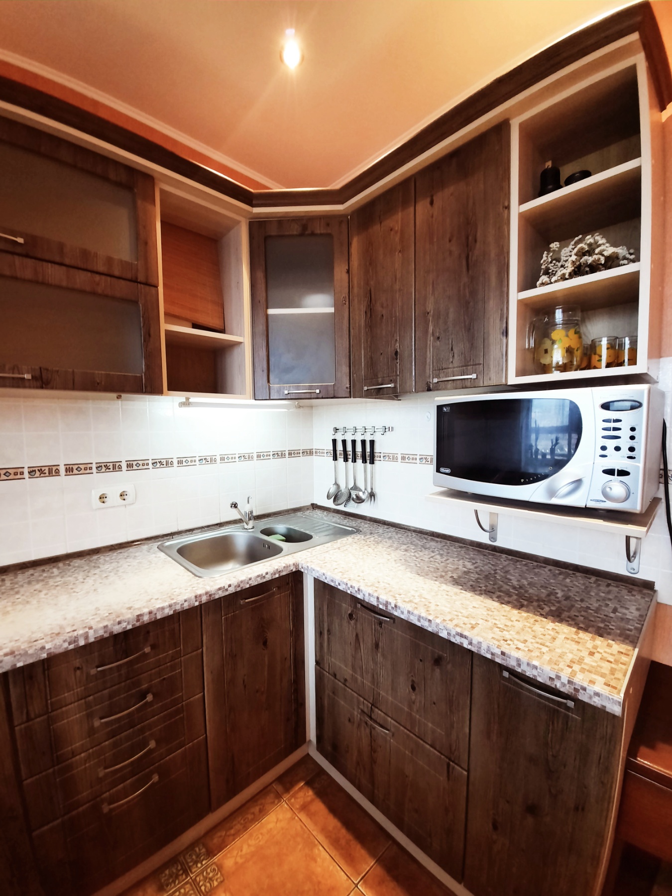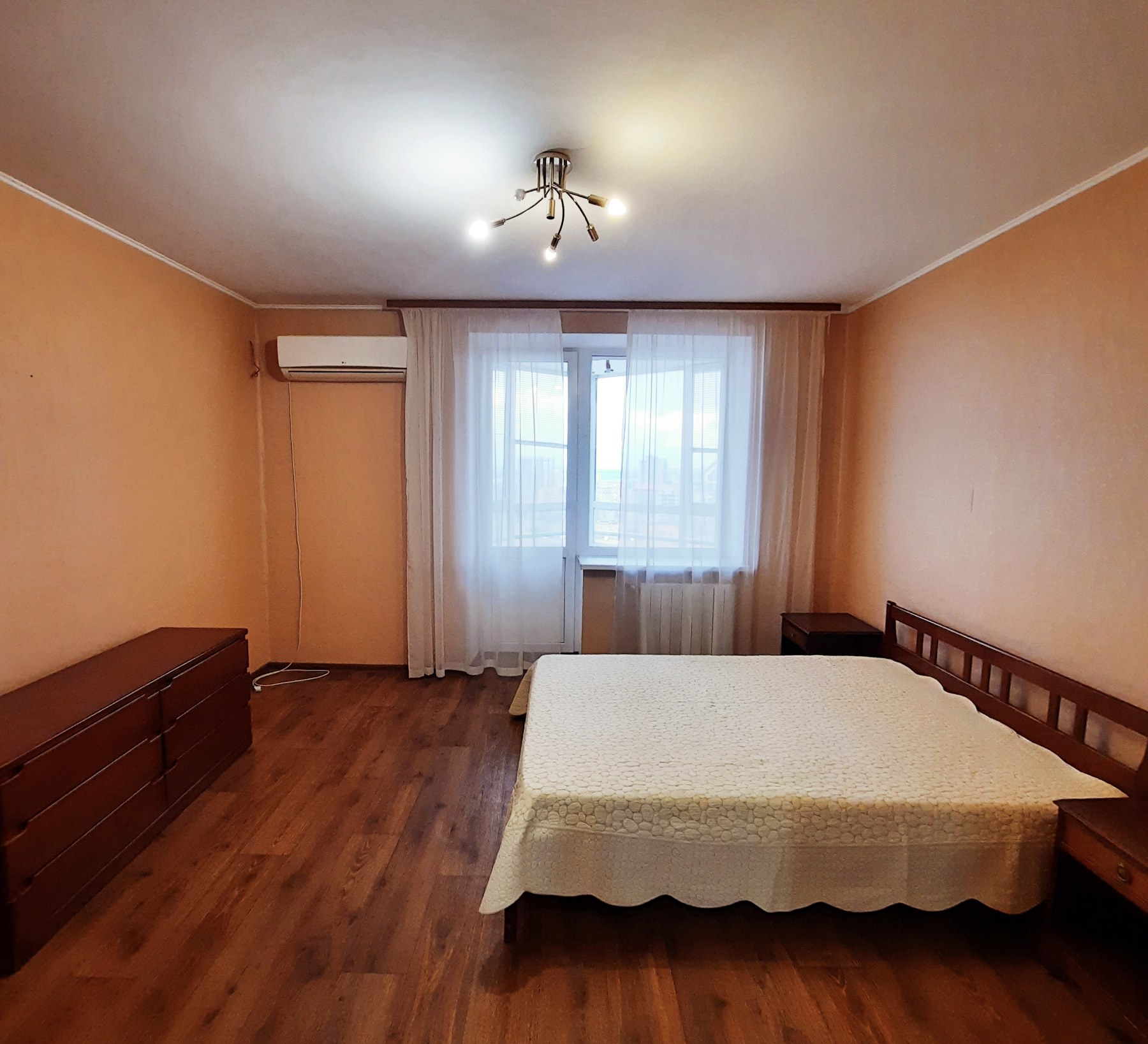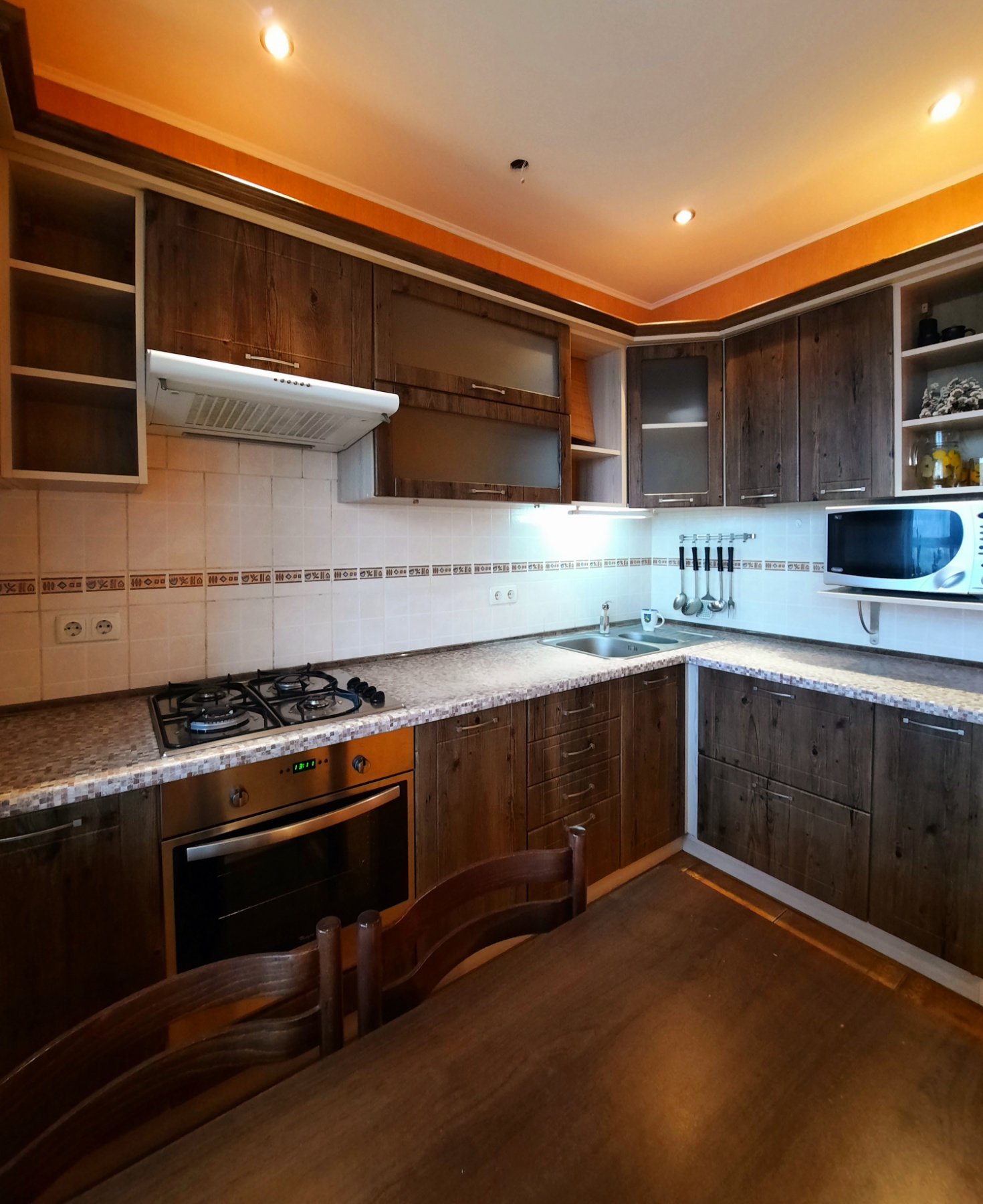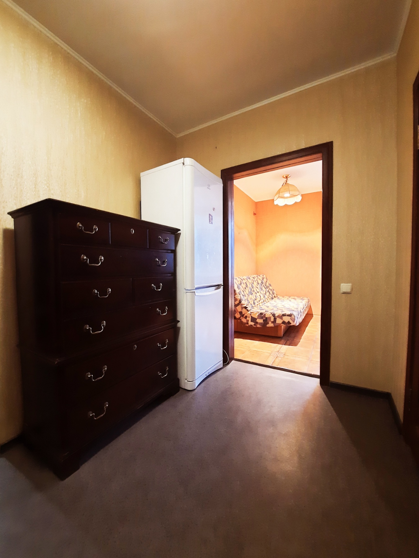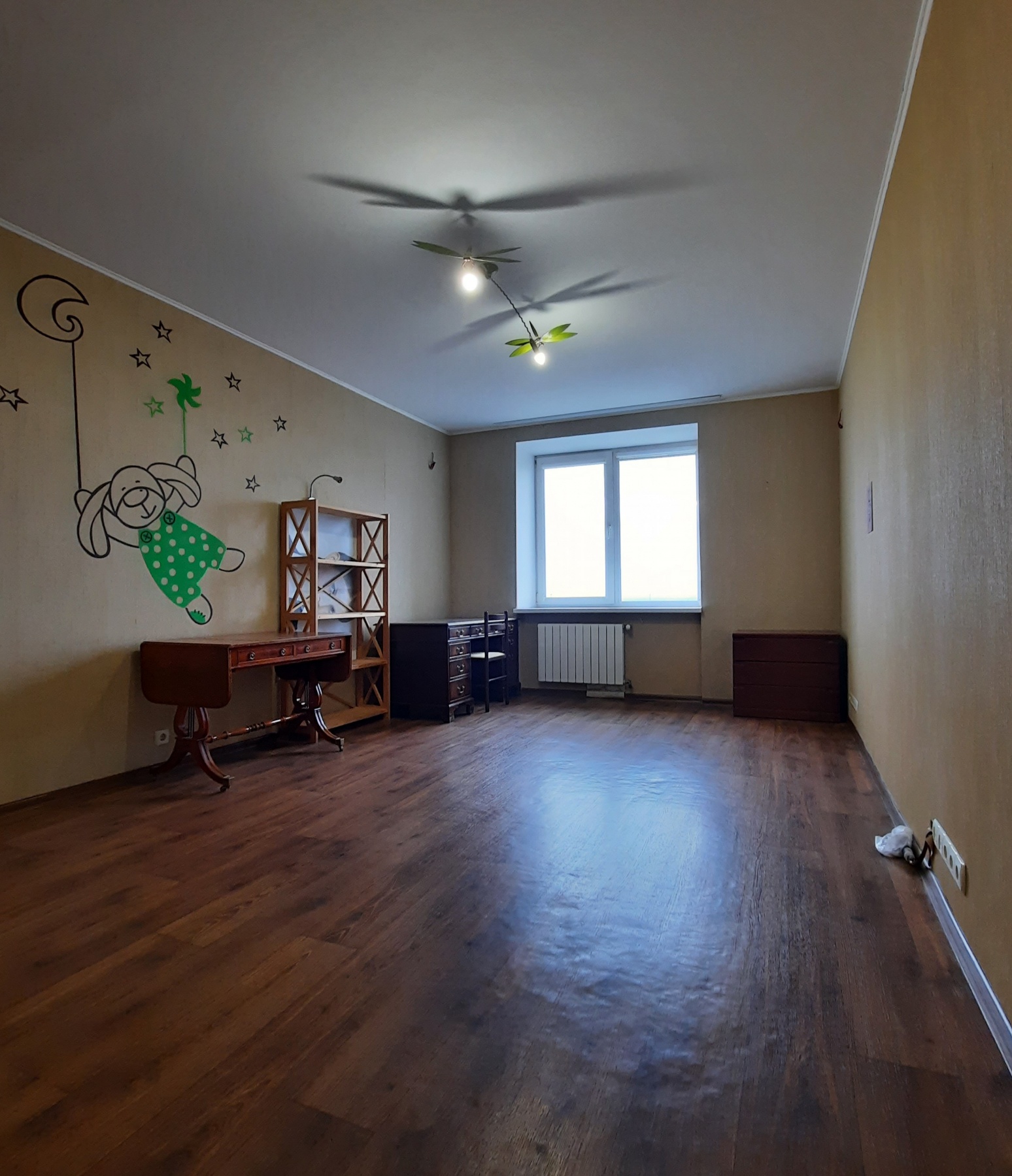 На кухне 13 кв. м остается вся мебель отличного качества со встроенной бытовой техникой: газовая варочная поверхность, духовой шкаф, вытяжка, микроволновка, холодильник, бойлер на 80 л. В спальне 17 кв. м – двуспальная кровать, две прикроватные тумбочки, большая деревянная тумба под телевизор, кондиционер. В комнате 21 кв. м – антикварная мебель (бюро и письменный стол из натурального дерева), комод. В коридоре 8 кв. м – встроенный трёхстворчатый шкаф и большой деревянный комод. На полу по всей квартире постелен линолеум, на кухне – плитка, на стенах обои. В ванной комнате 3,7 кв. м и туалете 2,6 кв. м на полу и стенах – плитка.