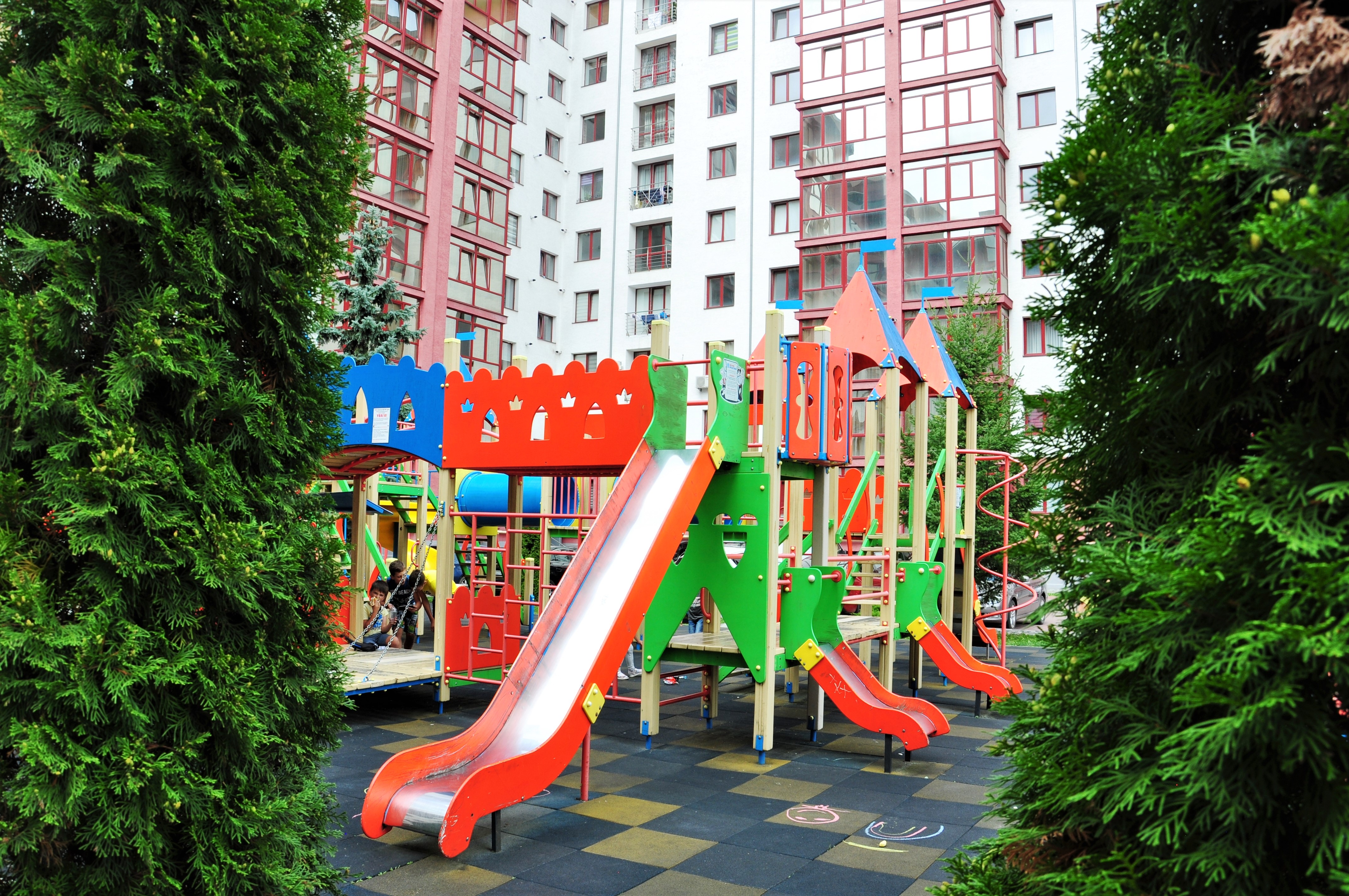 Будинок із закритою територією, де є футбольне поле, дитячий майданчик та зони відпочинку. Також є багато паркомісць.