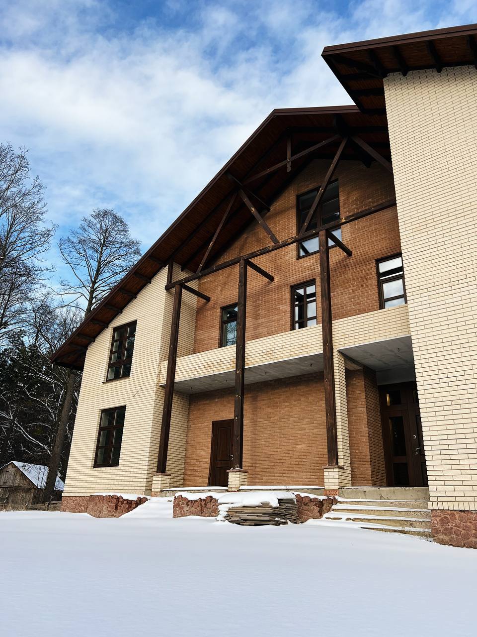 Зем. ділянка - 21 сотка, але з двох боків вже ліс. На території є гостьовий будинок або господарське приміщення. Задня частина двору - молодий сад, перед будинком поки вільна територія.
