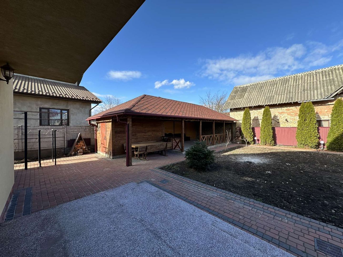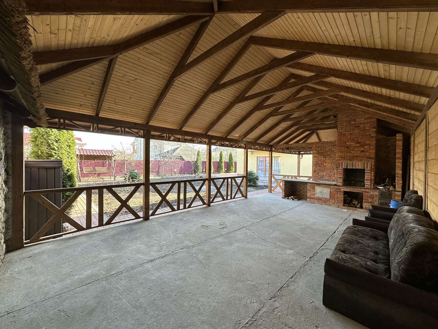 Будинок має два входи - центральний і позаду будинку є вихід на терасу, де крита велика альтанка з мангалом.