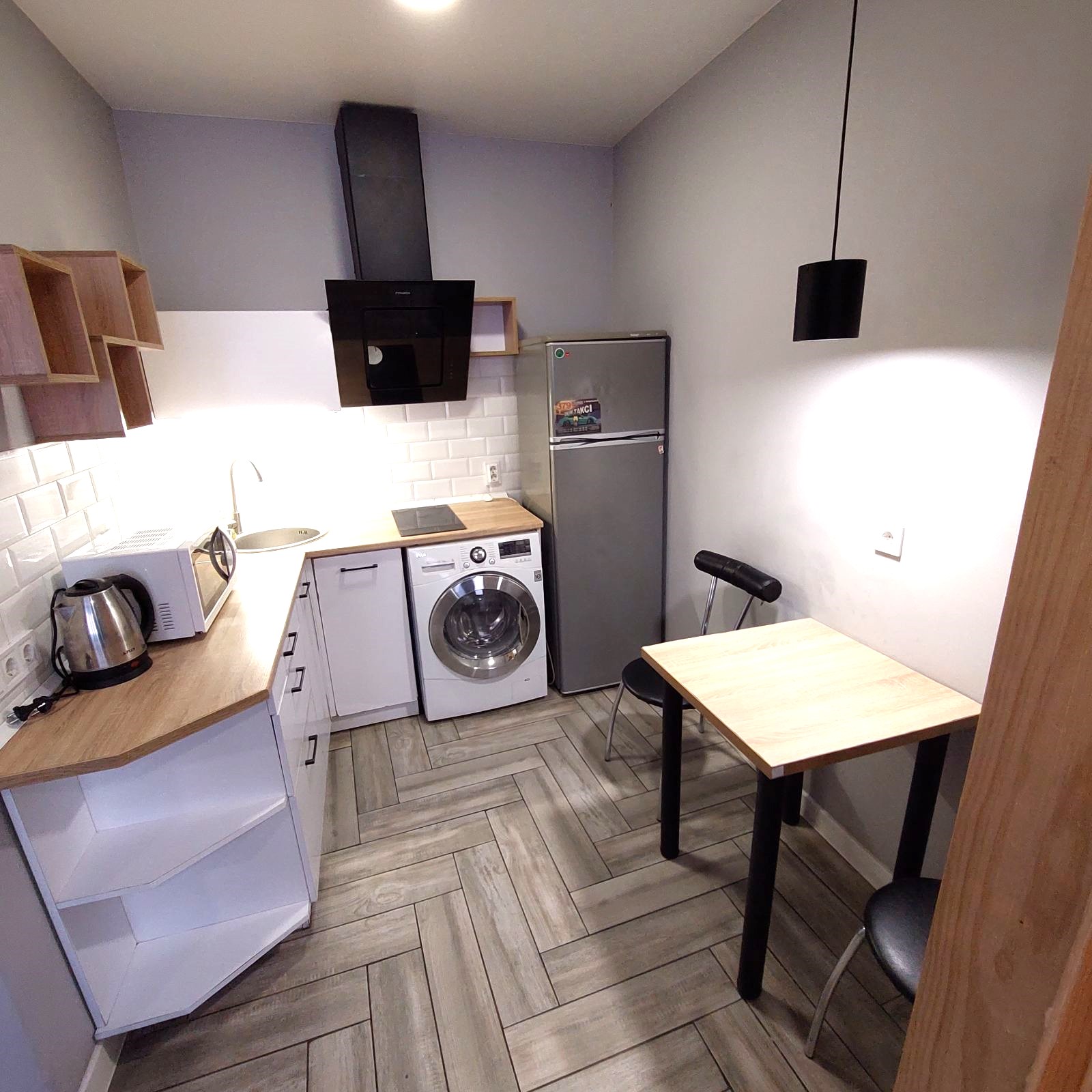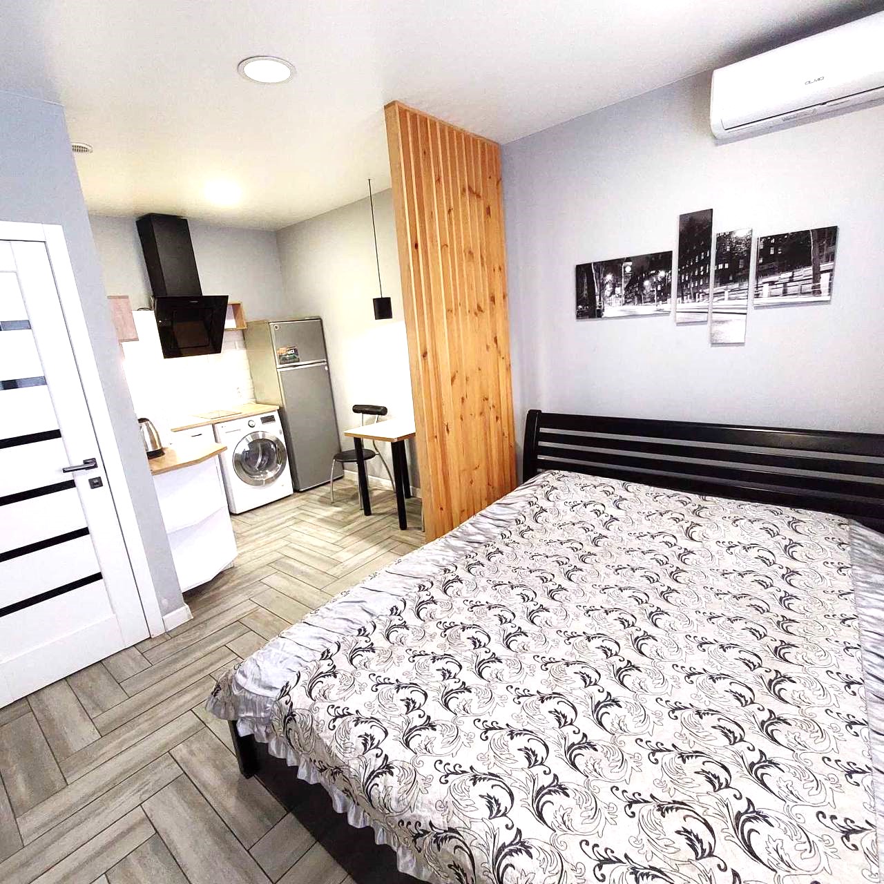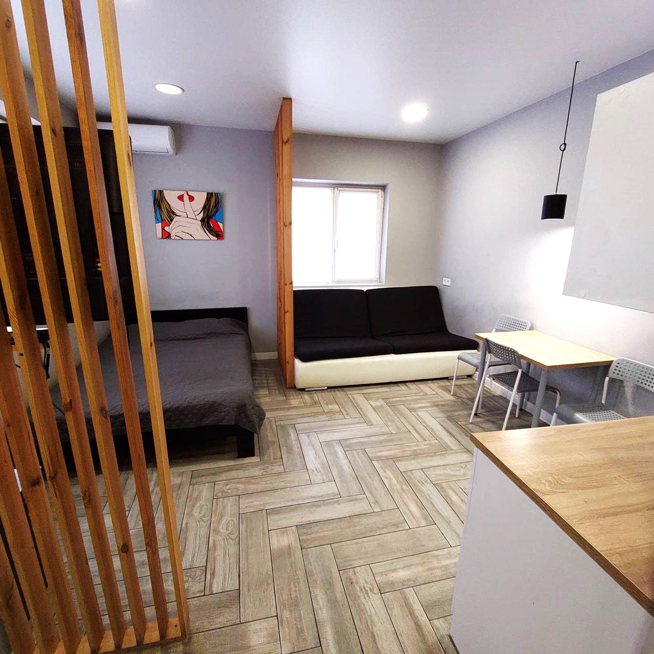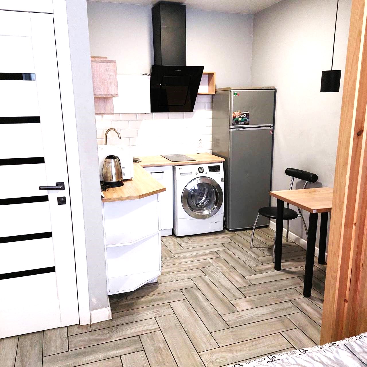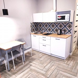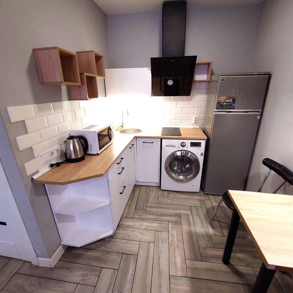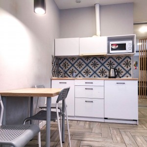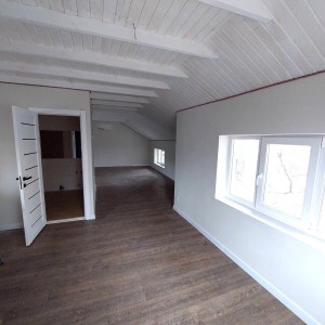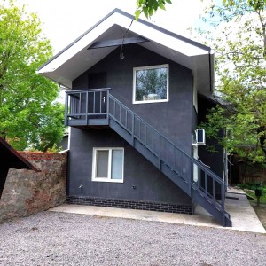 Загальна площа - 96,7 кв.м: перший поверх - дві ізольовані смарт-квартири, кожна з кухнею та санвузолм, по 22 кв.м, з євроремонтом та теплою підлогою. Повністю укомплектовані мебліми (дивани, ліжка, вбудовані кухонні меблі, столи, стільці) та побутовою технікою (тв плазми, холодильники, мікрохвильові пічі, варочні плити, пральні машини, кондиціонери, бойлери). другий поверх - 50 кв.м з окремим входом з вулиці, свої сходини. Квартира без меблів, зроблені всі виводи під комунікації, обладнаний санвузол.